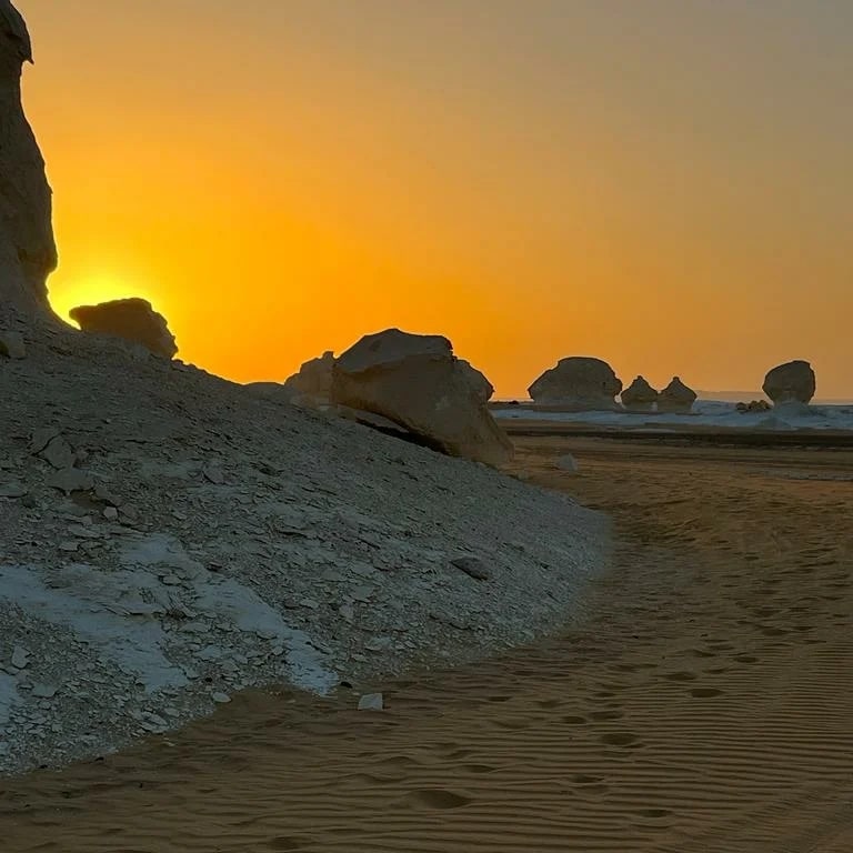after breakfast we drive to visit the new white desert, in the way we stop to collect the flower stones then arriving to the new white desert we visit the best spots then we drive to have lunch at the green spring after lunch we drive to visit the old white desert, then drive back to spend the night at the new white desert, dinner and spending the night under the stars.