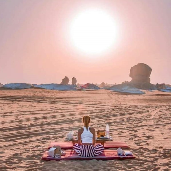 Pick up time At 07:00 from your hotel in Giza or in Cairo, drive to Bahariya Oasis , about 350 km east. This journey takes about 4 hours, there will be stops during the trip for WC and Coffee, You will take your 4x4 Jeep and drive to the black desert , The Lunch will be served here in El Haize oasis, Later on, day one, explore the white desert National Park, the most well-known desert destination in Egypt. Then drive to valley of Agabat , Valley of Agabat is deep within the white desert . You have to be there to feel the out-worldly beauty of the place. Millions of years ago, the place used to be under the sea. Over the years, unique rock formations of limestone, chalk (and maybe sand) developed. As the sky turns pink then deepest fiery orange, the rock-shapes fade, and silence are all around. Sitting around a small fire and enjoying the simplest meal of chicken, rice, and vegetables, you will feel like nothing has ever tasted so good. Bedouin staff will arrange dinner and desert camping.
