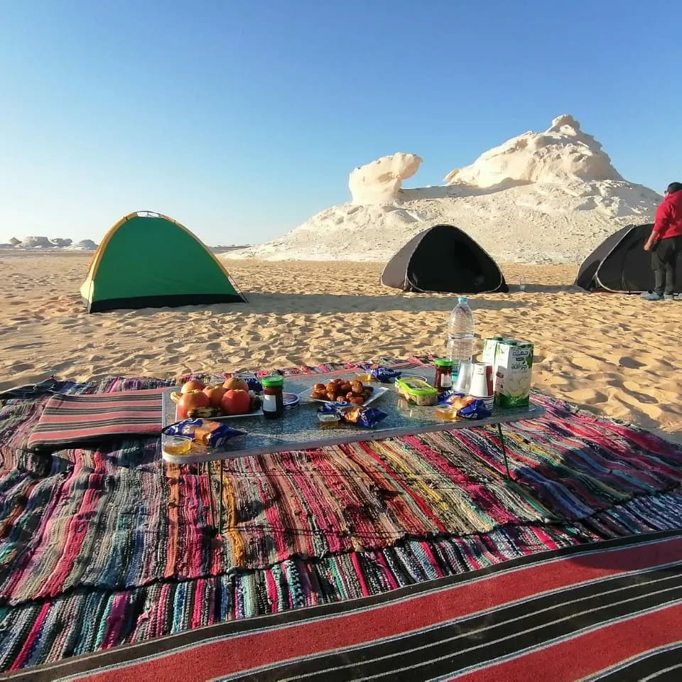 after having our breakfast we can walk littil around till our jeep be redy for us to start driving and resume exploring the best around white desert , we cross the valleys area and we see in our way the palm trees around and we visit the old water melon farms then we arrive to the green spring to have our lunch then we drive to visit Old Santa tree and the old white desert and tents area then the new white desert with all the lovely formations of the limestone then we find a nice spot to make our camp to have dinner and tea around the fire then spending the night under the stars.